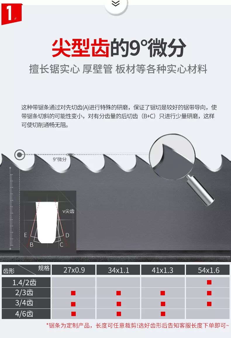 二、就要去合理的去选择齿形,一般我们说双金属带锯条是几齿的其实我们都指的是双金属带锯条的一英寸有多少的尺,例如一些特殊的箱4/6齿指的就是带锯条的齿形的变化周期有时是4个齿有时候是6个齿。壁越厚的就要去选择齿形就越大一点的,相反就要选择小的,它的目的就是为了减小材料对锯齿的冲击。